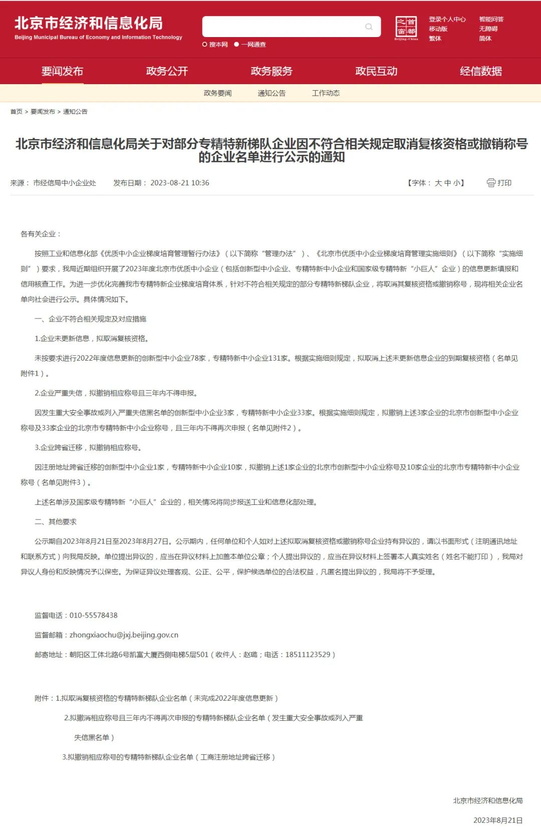 8月21日,北京市經(jīng)信局官網(wǎng)公布消息顯示,為進(jìn)一步優(yōu)化完善北京市專精特新企業(yè)梯度培育體系,針對不符合相關(guān)規(guī)定的部分專精特新梯隊(duì)企業(yè),將取消其復(fù)核資格或撤銷稱號,并將相關(guān)企業(yè)名單向社會進(jìn)行公示。公示名單共涉及北京174家專精特新中小企業(yè)和82家創(chuàng)新型中小企業(yè)!