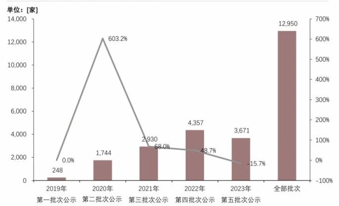 自2019年啟動專精特新“小巨人”企業(yè)培育工作以來,企業(yè)數(shù)量呈階段性變化。早期認(rèn)定數(shù)量穩(wěn)步增長,進(jìn)入“十四五”時期,隨著培育工作上升至國家戰(zhàn)略高度,相關(guān)政策不斷完善,如《“十四五”促進(jìn)中小企業(yè)發(fā)展規(guī)劃》明確培育目標(biāo),《優(yōu)質(zhì)中小企業(yè)梯度培育管理暫行辦法》細(xì)化評定標(biāo)準(zhǔn),地方政府也紛紛出臺配套政策,推動2021—2022年企業(yè)認(rèn)定數(shù)量快速攀升。但現(xiàn)階段認(rèn)定速度有所放緩,第五批次認(rèn)定數(shù)量相比第四批次有所減少。