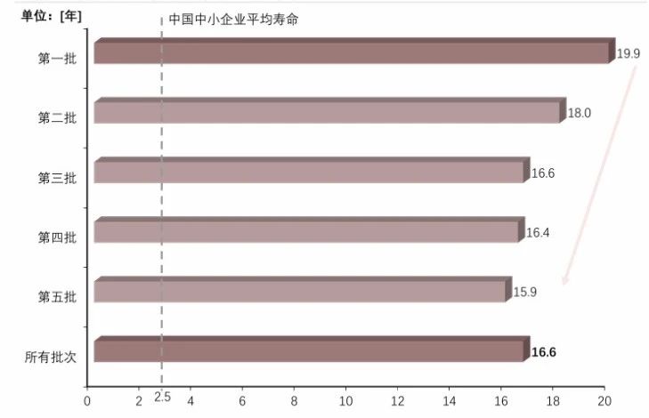 專精特新“小巨人”企業(yè)平均成立年限為16.6年,遠(yuǎn)超中國中小企業(yè)平均壽命2.5年,這表明企業(yè)需經(jīng)過長時間專業(yè)能力積累和沉淀,憑借過硬的技術(shù)、產(chǎn)品及抗風(fēng)險能力,才能進(jìn)入穩(wěn)定發(fā)展階段。從各批次來看,2019—2023年五批次企業(yè)平均壽命呈遞減趨勢,反映出經(jīng)濟發(fā)展、企業(yè)擴張和政策支持使專精特新“小巨人”企業(yè)成長周期縮短,未來有望實現(xiàn)更快成長。
