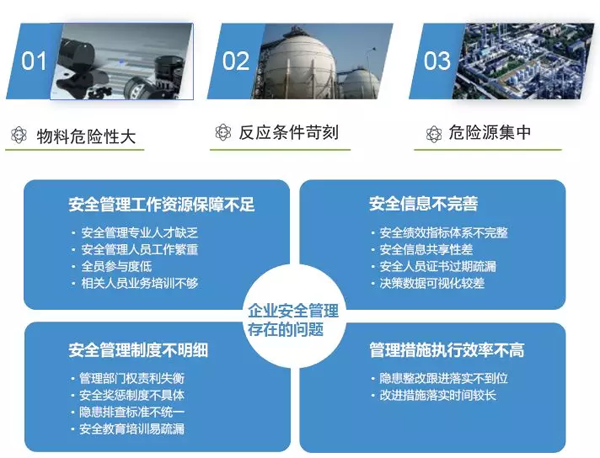 隨著社會對企業(yè)安全生產(chǎn)和環(huán)境保護(hù)的重視程度日益提高,安全、環(huán)保已成為化工企業(yè)的核心競爭力。對此,從國家層面到地方政府制定了一系列安全、環(huán)保管理的法律法規(guī),企業(yè)也相應(yīng)制定了一系列管理制度,以確保安全、環(huán)保管理的合法合規(guī)。然而,仍然存在大量違章指揮、違章操作、違反勞動紀(jì)律的現(xiàn)象發(fā)生,從而導(dǎo)致嚴(yán)重事故的發(fā)生。在安全、環(huán)保管理過程中亟需一個標(biāo)準(zhǔn)化的解決方案推動制度的執(zhí)行及效果跟蹤,確保安全、環(huán)保管理措施的落地,為企業(yè)“零事故、零傷亡”目標(biāo)的實現(xiàn)保駕護(hù)航。