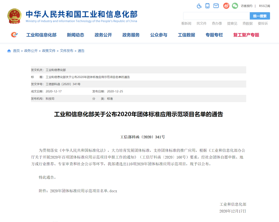 2020年團(tuán)體標(biāo)準(zhǔn)應(yīng)用示范項(xiàng)目是為貫徹落實(shí)《中華人民共和國(guó)標(biāo)準(zhǔn)化法》,大力培育發(fā)展團(tuán)體標(biāo)準(zhǔn),支持團(tuán)體標(biāo)準(zhǔn)的推廣應(yīng)用,根據(jù)《工業(yè)和信息化部辦公廳關(guān)于開展2020年百項(xiàng)團(tuán)體標(biāo)準(zhǔn)應(yīng)用示范項(xiàng)目申報(bào)工作的通知》(工信廳科函〔2020〕160號(hào))要求,經(jīng)社會(huì)團(tuán)體自愿申報(bào)、地方或行業(yè)推薦、專家審查和社會(huì)公示等環(huán)節(jié),由工業(yè)和信息化部遴選后予以公布。