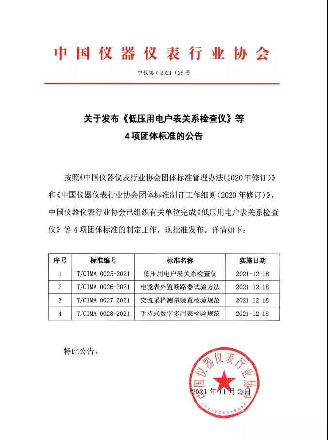關(guān)于發(fā)布《低壓用電表關(guān)系檢查儀》等4項團體標準的