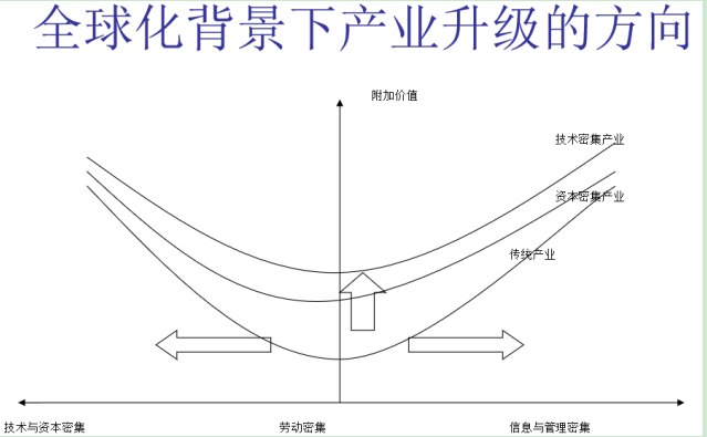 這條三條線代表不同的產業,最低的是傳統產業,往上是資本密集產業、技術密集產業。在同等價格環節上,它們都會有一個升級的過程??v向是傳統產業升級,叫產業間的升級。因為有了全球價值鏈,一個國家的升級有了兩個新的方向,在微笑曲線向兩端升級,就是從低附加價值環節向上游研發和復雜零部件生產升級,以及向下游去做服務、做品牌。在新的全球化背景下,一個國家的升級有了三個方向,既有傳統的產業間升級,同時又有了價值鏈的升級。這是我們討論全球價值鏈帶來的一個很重要的新思路。