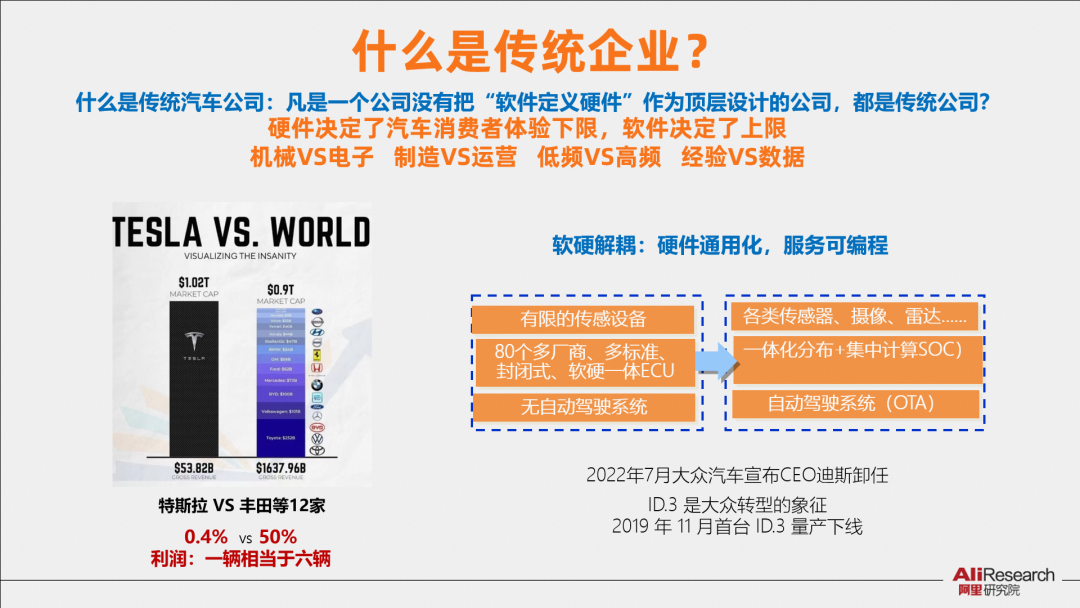 在過去10年,制造業(yè)企業(yè)持續(xù)推進(jìn)數(shù)字化轉(zhuǎn)型。作為全球汽車工業(yè)領(lǐng)導(dǎo)者的大眾,推進(jìn)汽車電動化和智能化。2019年1月大眾CEO迪斯(Herbert Diess)發(fā)表《重新定義大眾:一家由軟件驅(qū)動的汽車公司》,提出成為第一家區(qū)分開軟件和硬件的汽車公司。2019 年 6 月,大眾獨(dú)立軟件部門 Car Softwar,提出到 2025 年,自研軟件的比例從不到 10% 上升到 60%,并構(gòu)建汽車操作系統(tǒng) VW.OS、重構(gòu)電子電氣架構(gòu)。發(fā)起了ID.3項目,作為大眾數(shù)字化、電氣化轉(zhuǎn)型的旗艦項目,在某種程度上也是德國數(shù)字化轉(zhuǎn)型的代表。首批汽車下線,時任德國總理的默克爾參加新車下線儀式。但新能源車在中國市場上的優(yōu)勢地位并不突出,軟件還面臨一些問題和挑戰(zhàn)。