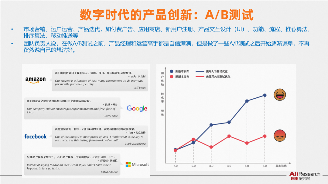 如何應(yīng)對需求巨變,企業(yè)需要重構(gòu)自己的研發(fā)、生產(chǎn)、服務(wù)體系,邁向高頻競爭時代,以供給體系的高頻創(chuàng)新應(yīng)對需求的巨變。過去國際互聯(lián)網(wǎng)企業(yè)面對市場營銷、運(yùn)戶運(yùn)營、產(chǎn)品迭代,如付費(fèi)廣告、應(yīng)用商店、新用戶注冊、產(chǎn)品交互設(shè)計(UI)時,都會基于數(shù)據(jù)進(jìn)行A/B測試,進(jìn)行快速決策。亞馬遜貝索斯說,我們的成功來自于我們每天、每周、每月、每年的所做的實驗數(shù)量;微軟CEO說,與其說“我有一想法”,不如說“我有一個新假設(shè),讓我們試驗一下”。A/B測試是數(shù)字時代產(chǎn)品創(chuàng)新的基本模式。