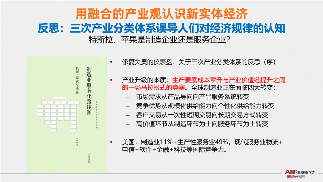 我在10年前出版的著作《制造業(yè)服務(wù)路線圖》中,就提出一個有爭議的觀點(diǎn),當(dāng)我們重新思考制造業(yè)和服務(wù)發(fā)展實踐時,需要反思:100年前提出的三次產(chǎn)業(yè)分類體系會不會誤導(dǎo)人們對經(jīng)濟(jì)規(guī)律的認(rèn)知。基于現(xiàn)有的經(jīng)濟(jì)常識:特斯拉、蘋果是制造業(yè)公司還是服務(wù)業(yè)公司?這個其實是說不清楚的,它們已經(jīng)融合了。