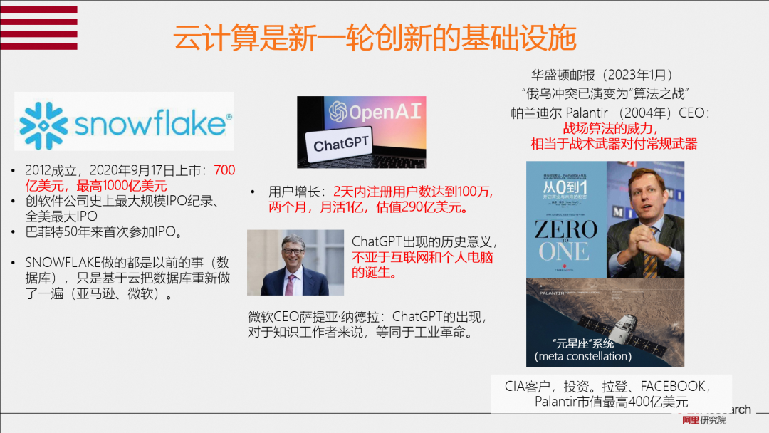 我們正在進(jìn)入云計算時代,云計算不僅是一個商業(yè)基礎(chǔ)設(shè)施,也是一個創(chuàng)新基礎(chǔ)設(shè)施,云計算是數(shù)字技術(shù)、新企業(yè)孕育孵化的搖籃。中國云上創(chuàng)新與美國差距仍在擴(kuò)大。當(dāng)下,大家都在討論Chat GPT,有人問中國為什么沒有Chat GPT?這個問題問錯了,正確的問題是,中國為什么沒有OPEN AI?中國為什么沒有SNOWFLAKE?中國為什么沒有Palantir?還有其他一些富有創(chuàng)新的初創(chuàng)公司。