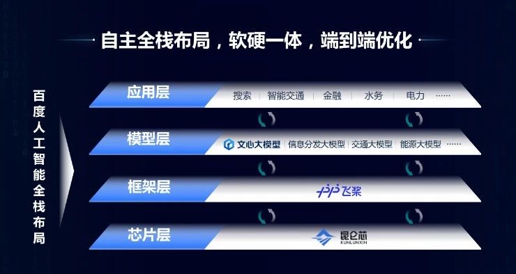 這方面百度有比較明顯的優勢,我們在四層當中每一層都有比較領先的產品,比如說芯片層有昆侖芯。這個也做了有十年之久,最早是因為搜索應用需要,我們買別人的芯片,畢竟太貴了,所以自己開發了。框架層是飛槳,飛槳今天在中國的市場份額第一。在模型層是文心大模型,其實除了文心一言,它是對標ChatGPT的之外,我們還有很多行業大模型,如交通大模型、能源大模型等。應用層的話,像百度搜索等都是我們比較領先的應用。