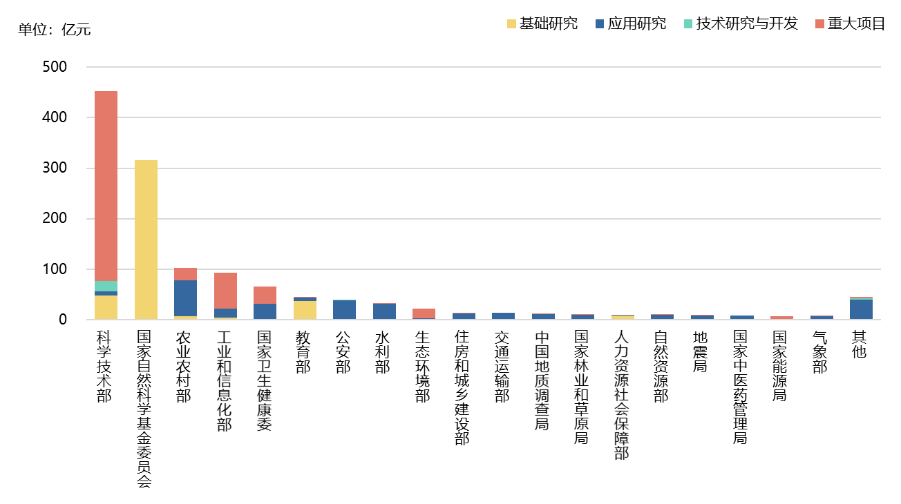 中央政府研發(fā)經(jīng)費(fèi)主要由少數(shù)部門管理。在40個(gè)中央政府研發(fā)經(jīng)費(fèi)管理部門中,科學(xué)技術(shù)部和國(guó)家自然科學(xué)基金委員會(huì)(簡(jiǎn)稱“基金委”)管理經(jīng)費(fèi)規(guī)模均超過300億元,占中央40個(gè)部門管理研發(fā)經(jīng)費(fèi)總支出的50%以上。就研發(fā)經(jīng)費(fèi)管理的類型而言,國(guó)家基金委經(jīng)費(fèi)全部用于基礎(chǔ)研究;科技部和工業(yè)和信息化部研發(fā)經(jīng)費(fèi)主要用于重大項(xiàng)目;農(nóng)業(yè)農(nóng)村部則將經(jīng)費(fèi)主要用于應(yīng)用研究。