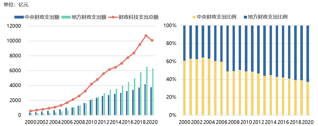 經(jīng)過20年發(fā)展,中央和地方在國(guó)家財(cái)政科技支出中的占比結(jié)構(gòu)發(fā)生實(shí)質(zhì)性變化。2000年,地方財(cái)政占比不到40%,2009年中央和地方各占50%,到2020年地方財(cái)政占比超過60%,如今地方財(cái)政已經(jīng)在國(guó)家財(cái)政科技支出中居主導(dǎo)地位,這表明地方政府越來越重視科技創(chuàng)新,加速推動(dòng)區(qū)域經(jīng)濟(jì)發(fā)展模式從要素驅(qū)動(dòng)向創(chuàng)新驅(qū)動(dòng)轉(zhuǎn)變。