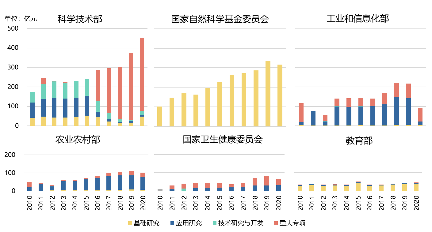 從時(shí)間上看,過去十年,科學(xué)技術(shù)部和基金委研發(fā)經(jīng)費(fèi)總量大且呈上升趨勢(shì);農(nóng)業(yè)農(nóng)村部研發(fā)經(jīng)費(fèi)總量于2020年首次超過工業(yè)和信息化部,躍居第三位;衛(wèi)健委和教育部研發(fā)經(jīng)費(fèi)總量保持穩(wěn)定。