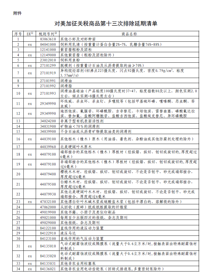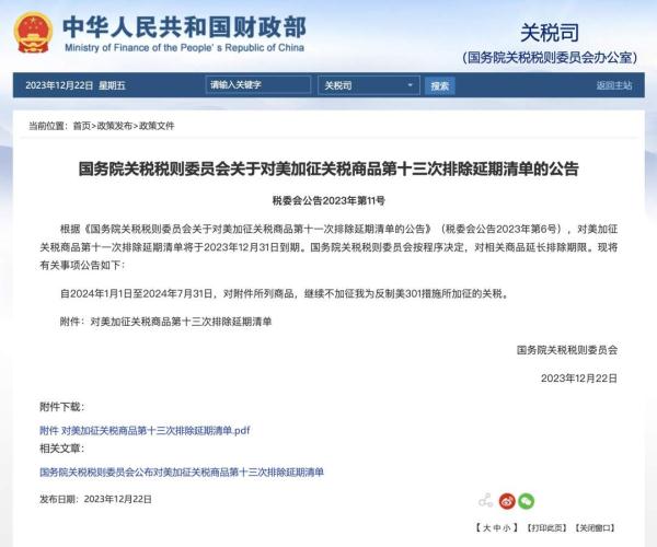 經(jīng)國務院批準,國務院關稅稅則委員會公布對美加征關稅商品第十三次排除延期清單,對《國務院關稅稅則委員會關于對美加征關稅商品第十一次排除延期清單的公告》(稅委會公告2023年第6號)中的相關商品,延長排除期限,自2024年1月1日至2024年7月31日,繼續(xù)不加征我為反制美301措施所加征的關稅。