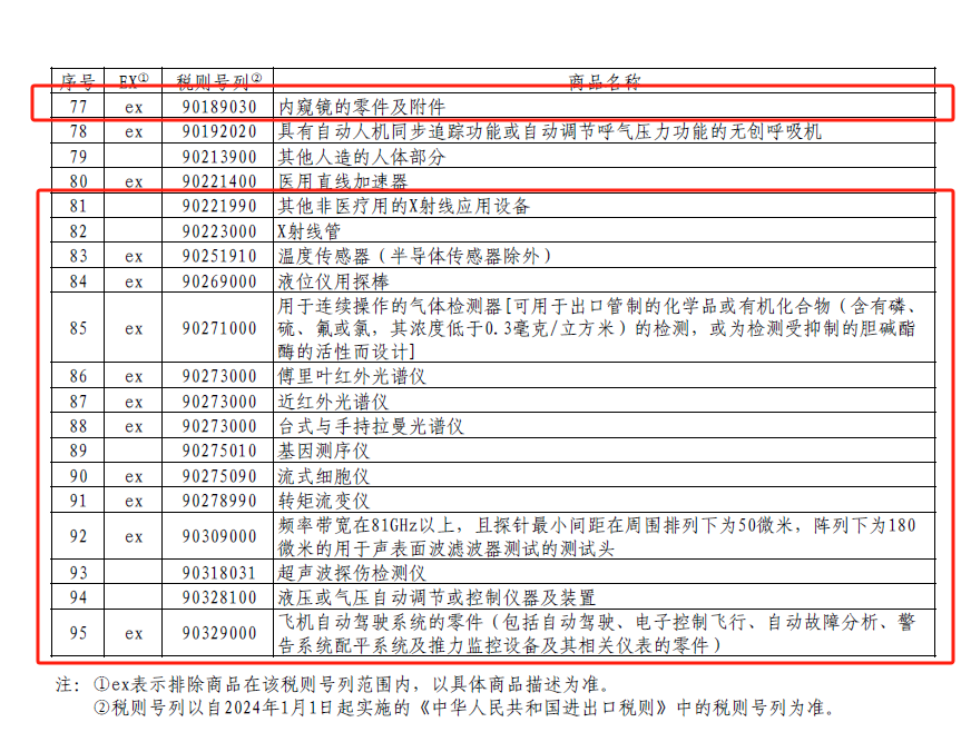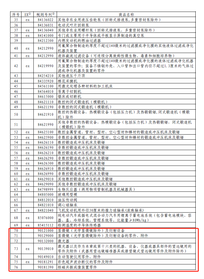 本次公布清單含顯微鏡(光學顯微鏡除外)及衍射設備;顯微鏡(光學顯微鏡除外)及衍射設備的零件、附件;激光器;激光器以及作為本章或第十六類的機器、設備、儀器或器具部件的望遠鏡用的零件及附件(武器用望遠鏡瞄準器具或潛望鏡式望遠鏡用零件及附件除外);自動駕駛儀用零件、附件;彩色超聲波診斷儀的零件及附件;核磁共振成像裝置零件;內窺鏡的零件及附件;其他非醫(yī)療用的X射線應用設備;X射線管;溫度傳感器(半導體傳感器除外);液位儀用探棒;用于連續(xù)操作的氣體檢測器[可用于出口管制的化學品或有機化合物(含有磷、硫、氟或氯,其濃度低于0.3毫克/立方米)的檢測,或為檢測受抑制的膽堿酯酶的活性而設計];傅里葉紅外光譜儀;近紅外光譜儀;臺式與手持拉曼光譜儀;基因測序儀;流式細胞儀;轉矩流變儀;超聲波探傷檢測儀;液壓或氣壓自動調節(jié)或控制儀器及裝置;飛機自動駕駛系統(tǒng)的零件等儀器及零部件。