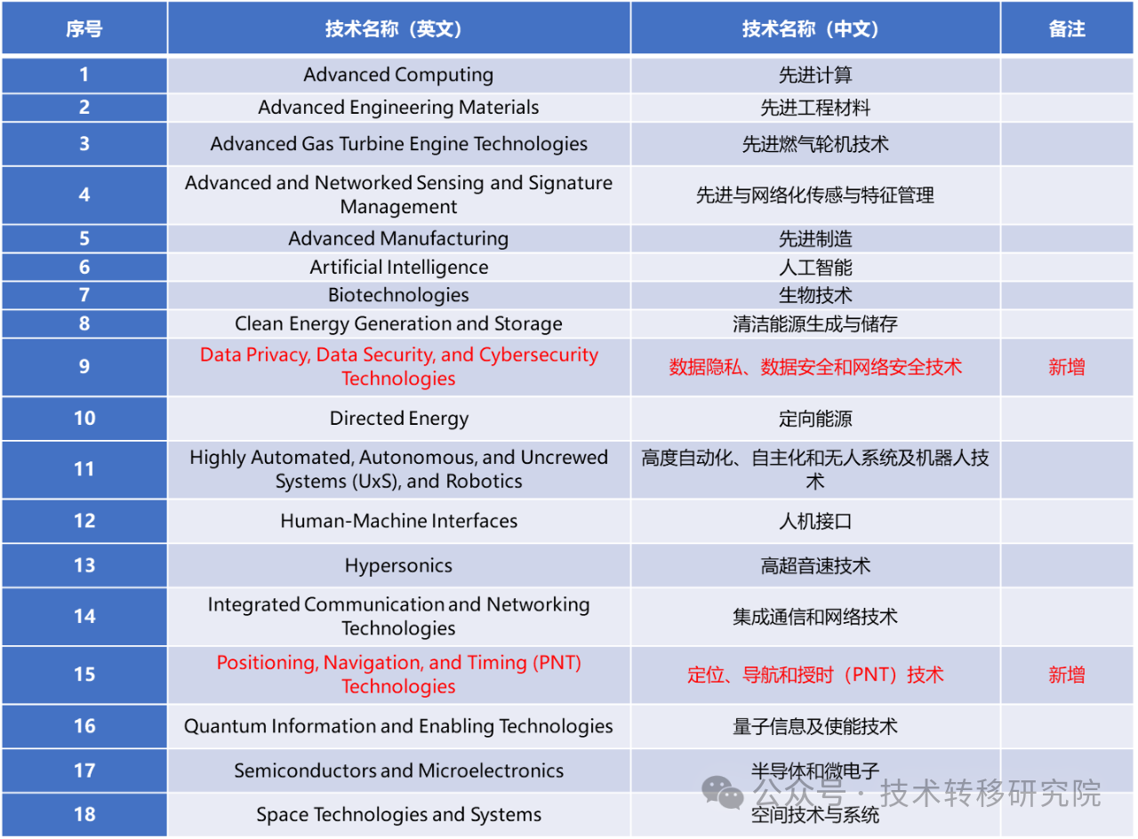 2024年最新版《關(guān)鍵和新興技術(shù)清單》是在2022年清單的基礎(chǔ)上更新而來,一共有18項(xiàng)技術(shù),包括先進(jìn)計(jì)算、先進(jìn)工程材料、人工智能、生物技術(shù)等技術(shù),與2022年版本相比,刪除了先進(jìn)核能技術(shù)、金融技術(shù)、網(wǎng)絡(luò)化傳感器和感知等3項(xiàng)技術(shù),新增了數(shù)據(jù)隱私、數(shù)據(jù)安全和網(wǎng)絡(luò)安全技術(shù)定位、導(dǎo)航和授時(shí)(PNT)技術(shù)等2項(xiàng)技術(shù)。