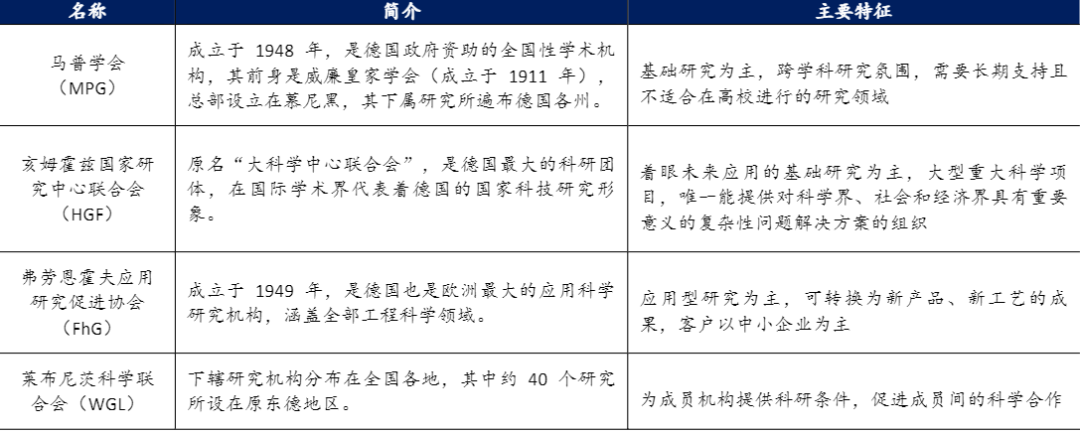 除弗勞恩霍夫協(xié)會外,德國還有馬普學(xué)會、亥姆霍茲國家研究中心聯(lián)合會和萊布尼茨科學(xué)聯(lián)合會三大國家科研組織,分別在基礎(chǔ)研究、未來應(yīng)用研究、促進研究機構(gòu)間的科學(xué)溝通等領(lǐng)域發(fā)揮作用。四大骨干科研組織為戰(zhàn)后德國工業(yè)的發(fā)展起到了重要的支撐作用。