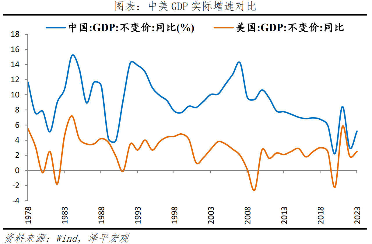 2023年中國GDP規模達126萬億元,相當于17.9萬億美元,保持世界第二大經濟體地位。美國2023年GDP為27.4萬億美元,中國GDP相當于美國的約65.4%,受匯率影響,中美差距略有擴大。2023年中國GDP實際增速5.2%,低于1978-2008年高速增長期的平均增速9.8%,高于美國的2.5%,越南、印度經濟增速分別為5.1%和6.7%。