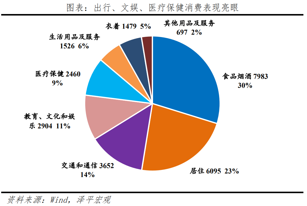消費以服務消費反彈最快,人均服務性消費支出增長14.4%,約占居民人均消費支出的比重達到45.2%。出行、文娛、醫療和智能消費成為消費新活力。2023年人均消費支出中,教育、文化和娛樂支出,交通和通信支出,醫療保健支出所占份額為10.8%、13.6%和9.2%,較2022年分別提高0.8、0.6和0.5個百分點。
