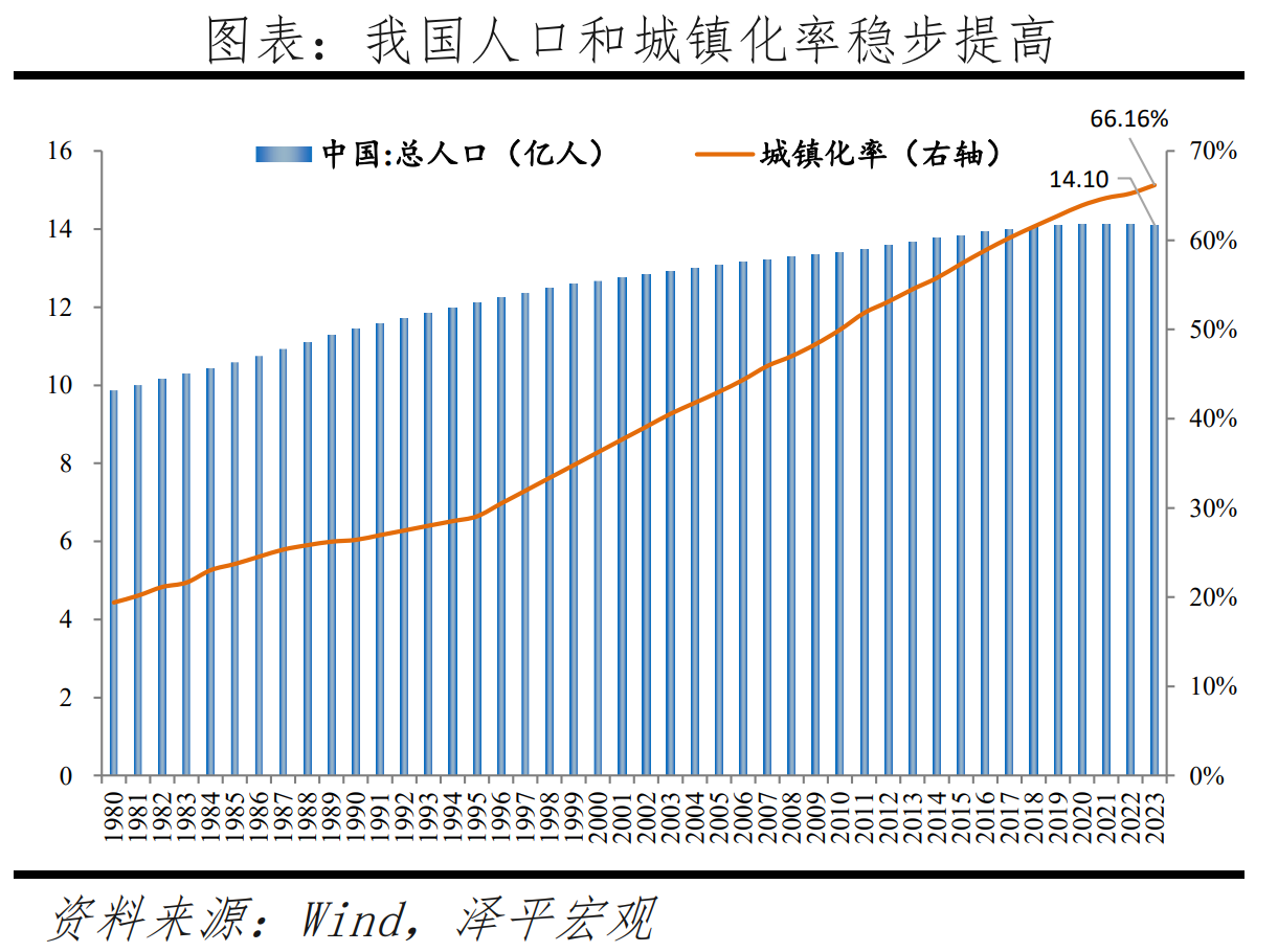 2023年末常住人口城鎮化率達66.16%,較上年末提高0.94個百分點,標志著當前我國新型城鎮化進程穩步推進,但較高收入經濟體的81.3%仍有15.1個百分點的空間。過去四十年,中國城鎮常住人口從1.7億快速增至9.3億,凈增加7.6億,城鎮化率從17.9%提升至66.2%,提高48.3個百分點,深刻地改變了中國經濟社會格局,成就了過去中國重化工業、大規模基礎設施投資、房地產、消費升級等的飛速發展。當前中國城鎮化率已高于55.3%的世界平均水平,達到中高收入經濟體水平,但明顯低于高收入經濟體的81.3%,中國城鎮化還有約15.1個百分點的空間。