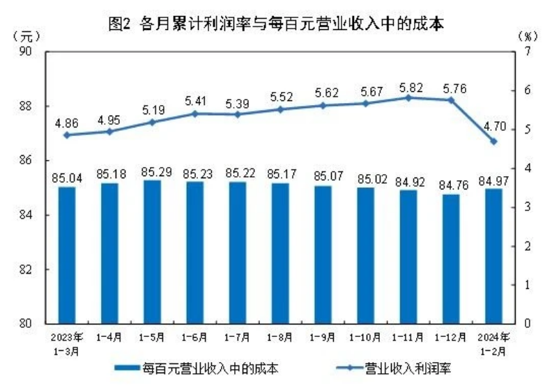 12月份,規模以上工業企業實現營業收入19.44萬億元,同比增長4.5%;發生營業成本16.52萬億元,增長4.6%;營業收入利潤率為4.70%,同比提高0.24個百分點。