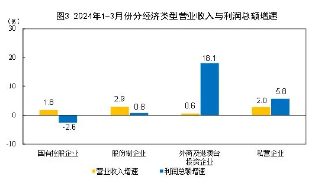1-3月份,規(guī)模以上工業(yè)企業(yè)中,國有控股企業(yè)實現(xiàn)利潤總額5738.2億元,同比下降2.6%;股份制企業(yè)實現(xiàn)利潤總額11203.0億元,增長0.8%;外商及港澳臺投資企業(yè)實現(xiàn)利潤總額3737.5億元,增長18.1%;私營企業(yè)實現(xiàn)利潤總額3679.7億元,增長5.8%。
