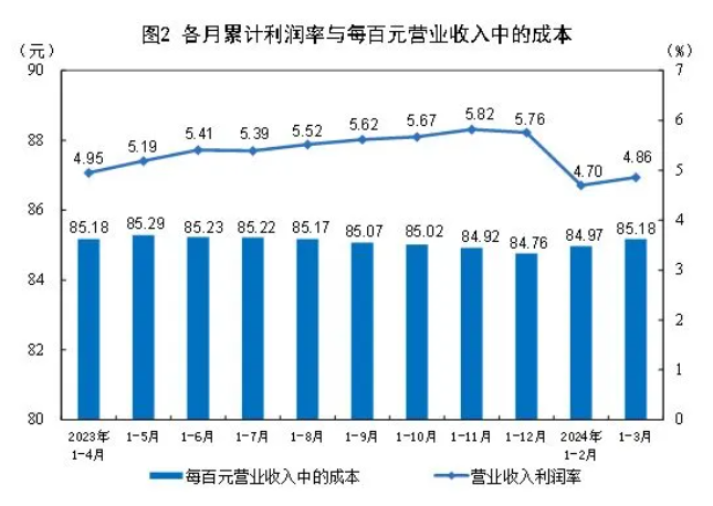 1-3月份,規(guī)模以上工業(yè)企業(yè)每百元營業(yè)收入中的成本為85.18元,同比增加0.16元;每百元營業(yè)收入中的費用為8.54元,同比減少0.07元。