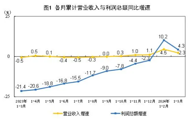 1-3月份,規(guī)模以上工業(yè)企業(yè)實現(xiàn)營業(yè)收入30.96萬億元,同比增長2.3%;發(fā)生營業(yè)成本26.38萬億元,增長2.5%;營業(yè)收入利潤率為4.86%,同比提高0.09個百分點。