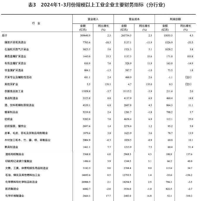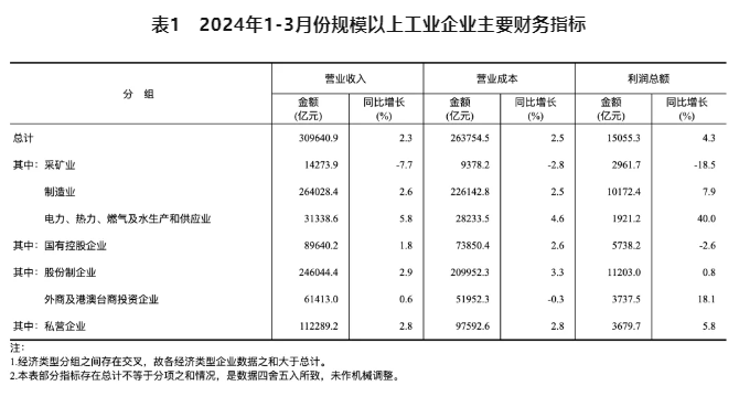 2024年1-3月份,全國規(guī)模以上工業(yè)企業(yè)實現(xiàn)利潤總額15055.3億元,同比增長4.3%(按可比口徑計算)。