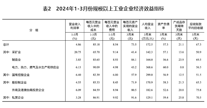 3月末,規(guī)模以上工業(yè)企業(yè)每百元資產實現(xiàn)的營業(yè)收入為73.5元,同比減少2.9元;人均營業(yè)收入為172.5萬元,同比增加7.5萬元;產成品存貨周轉天數為21.1天,同比持平;應收賬款平均回收期為67.3天,同比增加3.8天。