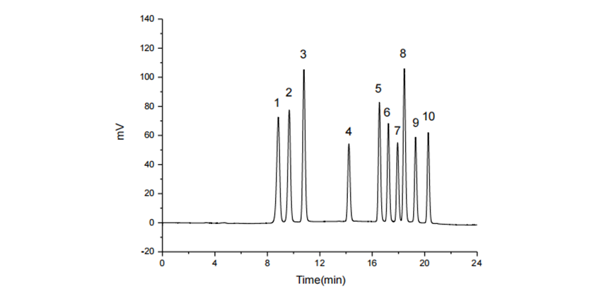 10種氨基甲酸酯在0.0510.0 mg/L(測試濃度)范圍內均達到0.9999線性相關系數,具有良好的線性相關性。