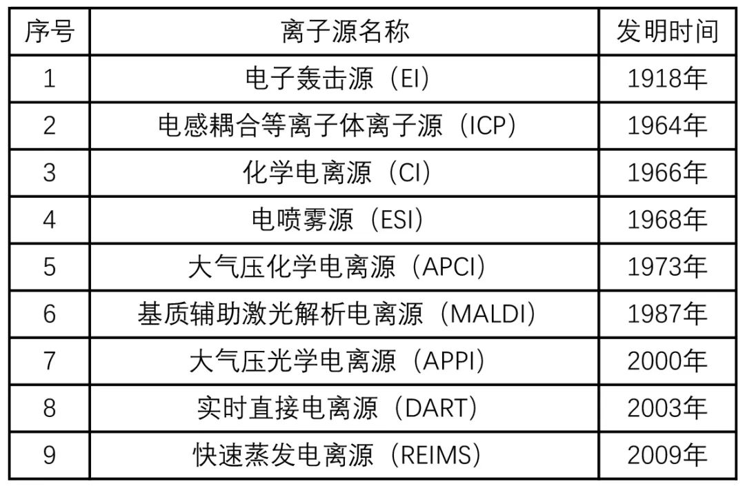 離子源將樣品中的分子或原子離子化,為質譜分析的核心過程提供關鍵離子來源。20世紀初,A.J. Dempster發明了電子轟擊源(EI),這一技術被視為離子源領域的開創性突破。1966年,產生了化學電離(CI)方法,上世紀八十年代,電噴霧電離(ESI)技術以及基質輔助激光解吸電離[10](MALDI)技術發明,并廣泛應用于生物醫學和生物質譜學領域,引領了質譜技術的新發展方向。大氣壓光學電離源(APPI)技術為難溶解或揮發性較低的樣品提供了有效的離子化方法,實時直接電離源(DART)[11]的問世使得質譜分析更加快速便捷。2009年,快速蒸發電離源(REIMS)技術的發明,進一步提高了樣品的分析速度和準確性,為臨床醫學等領域帶來了革命性的變革(表2)。總之,離子源技術的創新和升級為質譜技術提供了更廣泛的應用選擇。