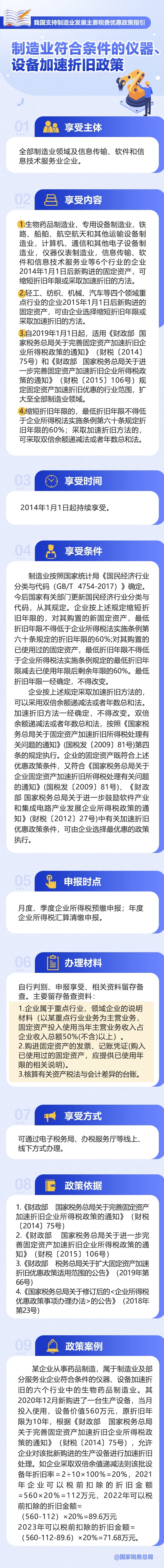 制造業(yè)是立國(guó)之本、強(qiáng)國(guó)之基,是實(shí)體經(jīng)濟(jì)的重要組成部分。中央經(jīng)濟(jì)工作會(huì)議指出,“落實(shí)好結(jié)構(gòu)性減稅降費(fèi)政策,重點(diǎn)支持科技創(chuàng)新和制造業(yè)發(fā)展”。為使大家更加全面熟悉了解政策、更加高效準(zhǔn)確適用政策,財(cái)政部、國(guó)家稅務(wù)總局近日發(fā)布《我國(guó)支持制造業(yè)發(fā)展主要稅費(fèi)優(yōu)惠政策指引》。今天帶你了解:制造業(yè)符合條件的儀器、設(shè)備加速折舊政策。