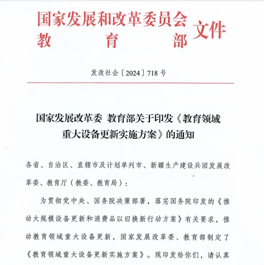 為貫徹黨中央、國務(wù)院決策部署,落實國務(wù)院印發(fā)的《推動大規(guī)模設(shè)備更新和消費品以舊換新行動方案》有關(guān)要求,推動教育領(lǐng)域重大設(shè)備更新,特制定本實施方案。