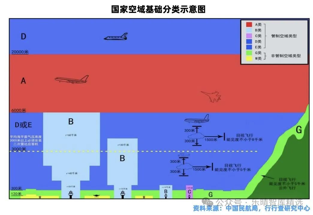 2023年12月民航局發布的《國家空域基礎分類方法》中,將空域劃分為A、B、C、D、E、G、W等7類,其中,A、B、C、D、E類為管制空域,G、W類為非管制空域。