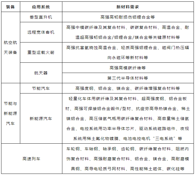 表1 運載工具領域新材料需求