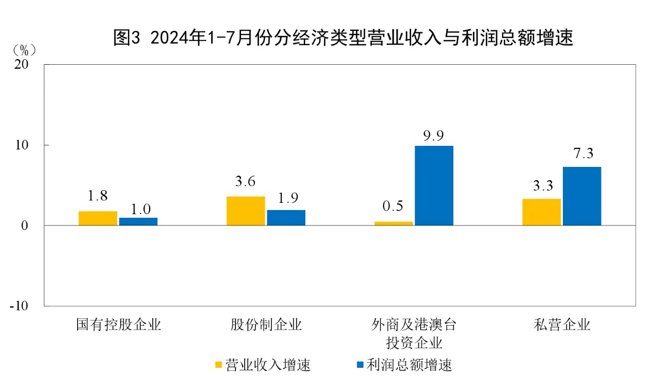 1—7月份,規(guī)模以上工業(yè)企業(yè)中,國有控股企業(yè)實(shí)現(xiàn)利潤總額13917.3億元,同比增長1.0%;股份制企業(yè)實(shí)現(xiàn)利潤總額30514.6億元,增長1.9%;外商及港澳臺投資企業(yè)實(shí)現(xiàn)利潤總額10184.9億元,增長9.9%;私營企業(yè)實(shí)現(xiàn)利潤總額11031.0億元,增長7.3%。