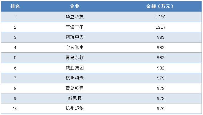 集中器及采集器中標(biāo)金額前十企業(yè)