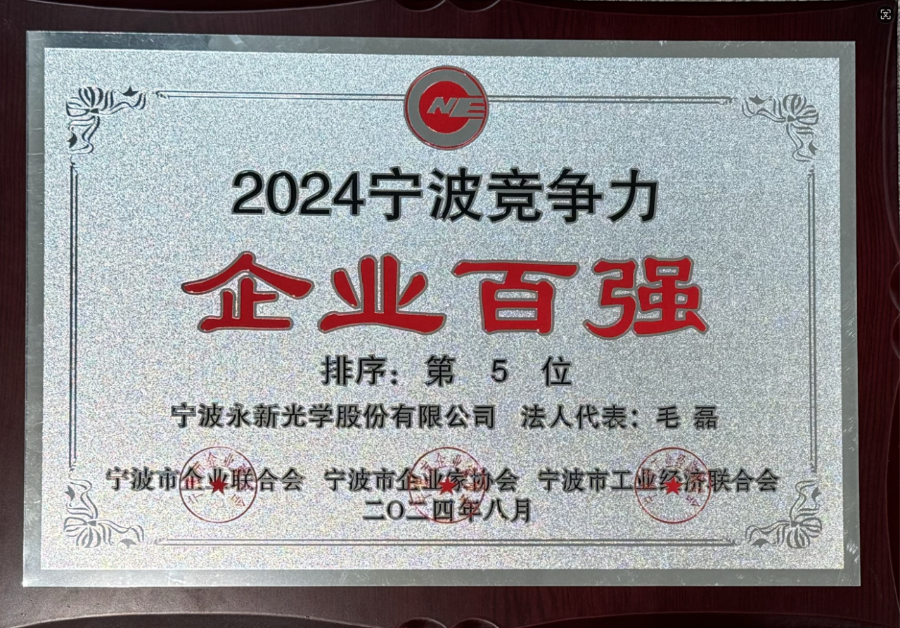 830日,寧波市企業聯合會、寧波市企業家協會、寧波市工業經濟聯合會正式發布2024寧波企業百強榜。永新光學憑借在科技、標準創新和企業高質量發展方面的卓越表現,再次榮登寧波·競爭力百強榜前十位強(本次第五位),這是公司自該榜單設立以來第十次獲此殊榮。