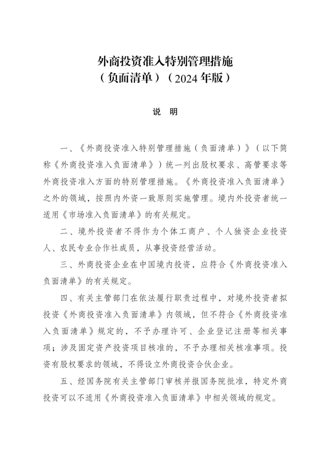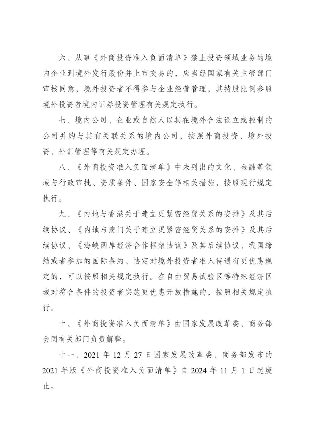 經(jīng)黨中央、國(guó)務(wù)院同意,國(guó)家發(fā)展改革委、商務(wù)部于2024年9月8日發(fā)布第23號(hào)令,全文發(fā)布《外商投資準(zhǔn)入特別管理措施(負(fù)面清單)(2024年版)》,自2024年11月1日起施行。《外商投資準(zhǔn)入特別管理措施(負(fù)面清單)(2021年版)》同時(shí)廢止。