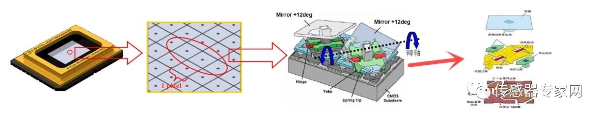 在一個DLP芯片里面微鏡數(shù)以百萬計,每一面反射鏡都可以獨立反轉(zhuǎn)運動,正負方向翻轉(zhuǎn),每秒鐘翻轉(zhuǎn)次數(shù)高達數(shù)萬次。下圖是DMD芯片每一個微鏡翻轉(zhuǎn),折射光線的過程,每一片微鏡都可以單獨控制,折射相應(yīng)的光線,從而形成不同的色彩、明暗,每一個微鏡就如同我們電視的每一個像素點。