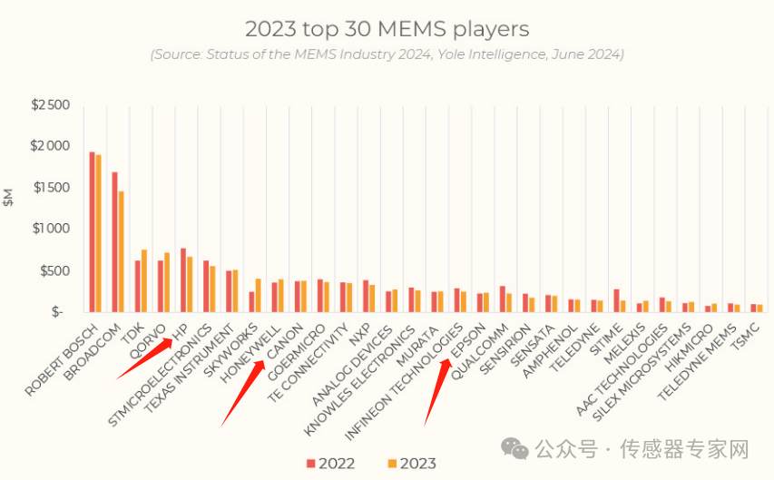 憑借MEMS噴墨打印頭的出貨量,惠普、愛普生、佳能等打印機廠商長期進入全球MEMS器件出貨量TOP 30名單中。