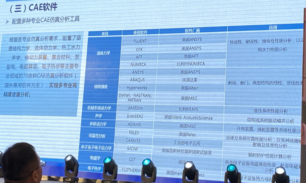 現場某專家稱,根據各專業仿真分析需求,他們配置了涵蓋結構力學、流體動力學、熱工水力、聲學、核動力裝置、復合材料、發配電、電磁兼容、電子熱學等主要專業領域的70余種CAE仿真分析軟件(國外商用軟件為主),實現多專業高精度定量分析。