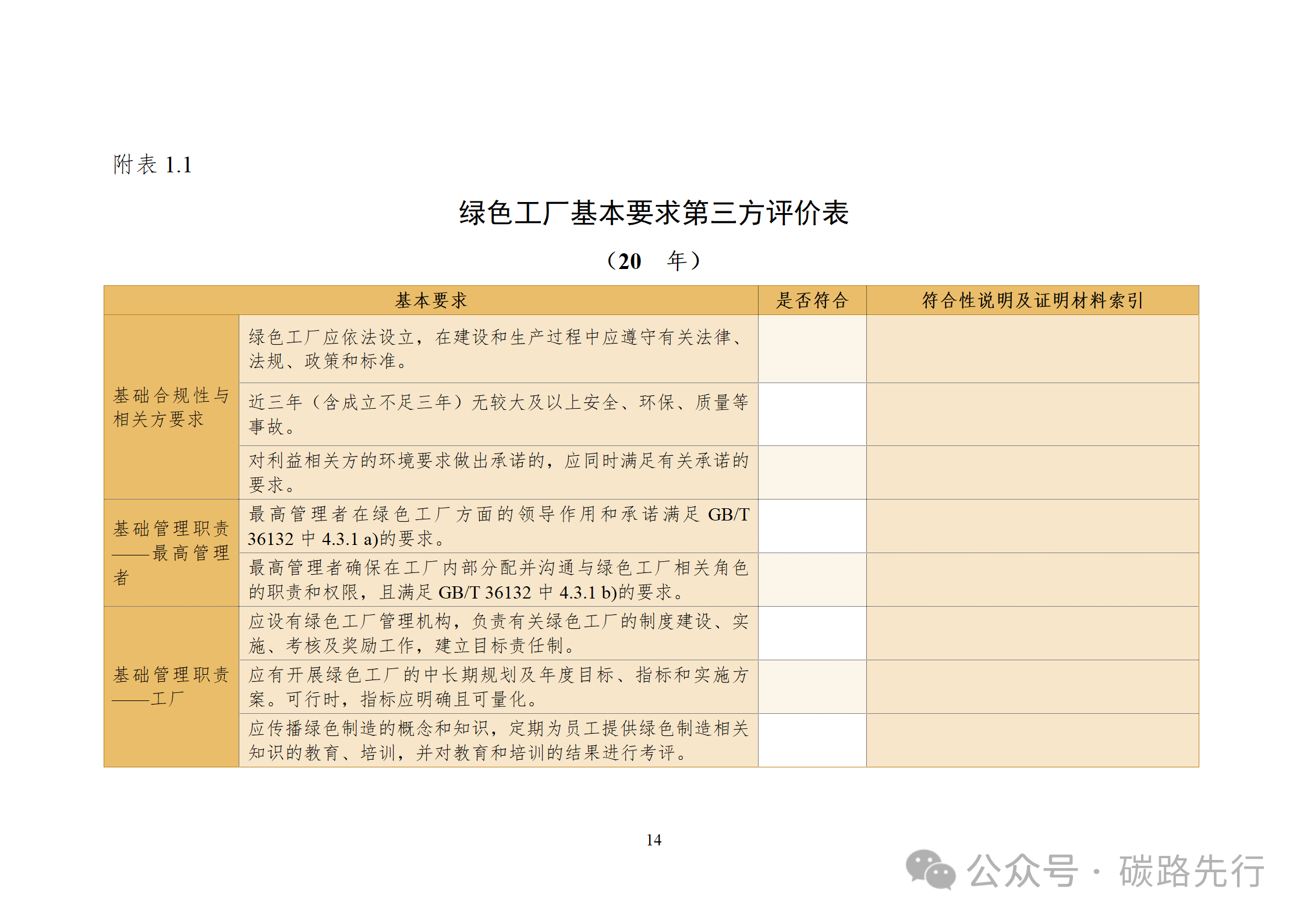 ①綠色工廠基本要求的符合情況;②6個(gè)一級(jí)指標(biāo);③加分項(xiàng):“零碳”工廠創(chuàng)建方面開展的工作情況。