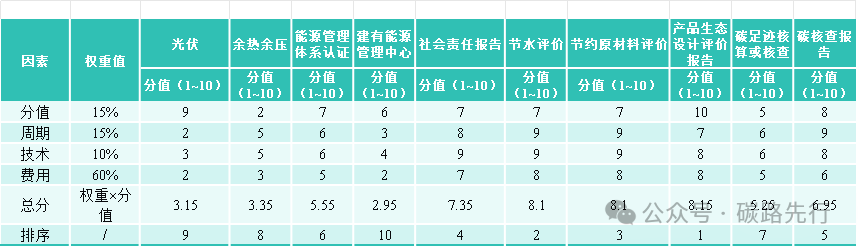 根據(jù)以上的拉分項(xiàng),我們將從這些項(xiàng)目在申報(bào)綠色工廠時(shí)所占的分值,實(shí)施的周期,實(shí)施的難易程度,實(shí)施的費(fèi)用進(jìn)行權(quán)重分析打分,來對(duì)申報(bào)綠色工廠時(shí)必要的補(bǔ)足材料進(jìn)行一個(gè)綜合性的排序。