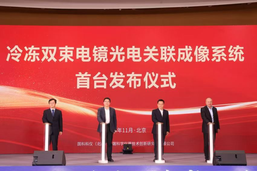 近日,中國科學院科技成果轉化融合點行動首場活動在京舉辦。會上,國科科儀控股企業國科科儀(北京)高端科學儀器技術創新研究院有限公司(簡稱國科儀器)與中國科學院生物物理研究所正式發布了國內首臺冷凍雙束電鏡光電關聯成像系統,北京市科委、中關村管委會黨組成員、副主任龔維冪,懷柔科學城黨工委委員、管委會副主任、懷柔區副區長蘭雄景,中國科學院生物物理所副所長柳振峰和國科科儀控股有限公司董事長李昕共同為該產品揭幕。