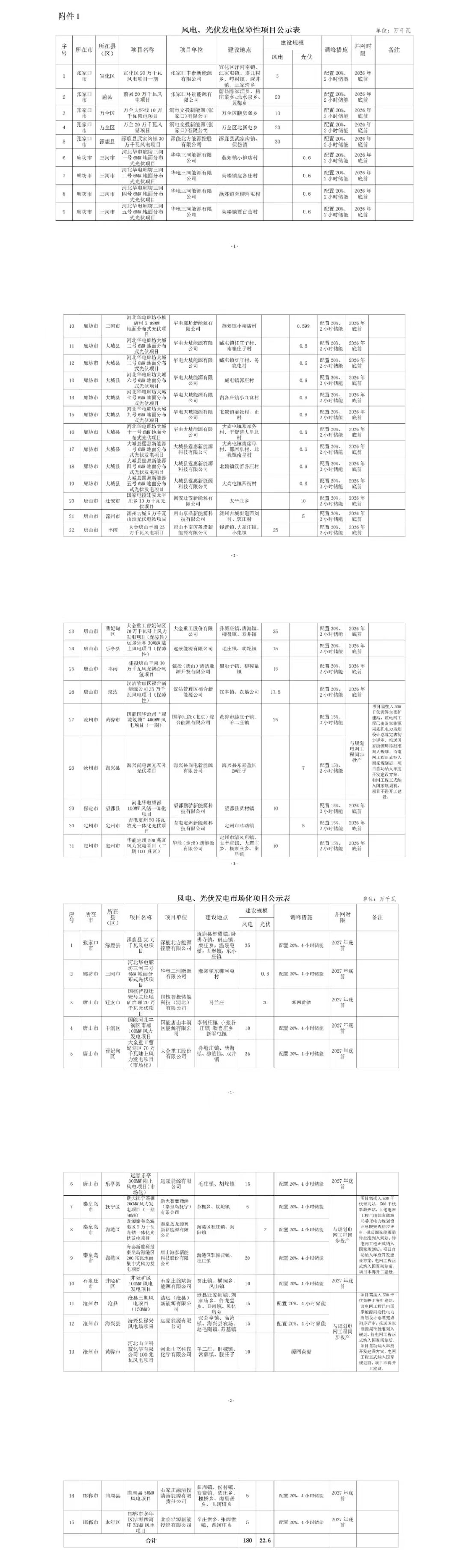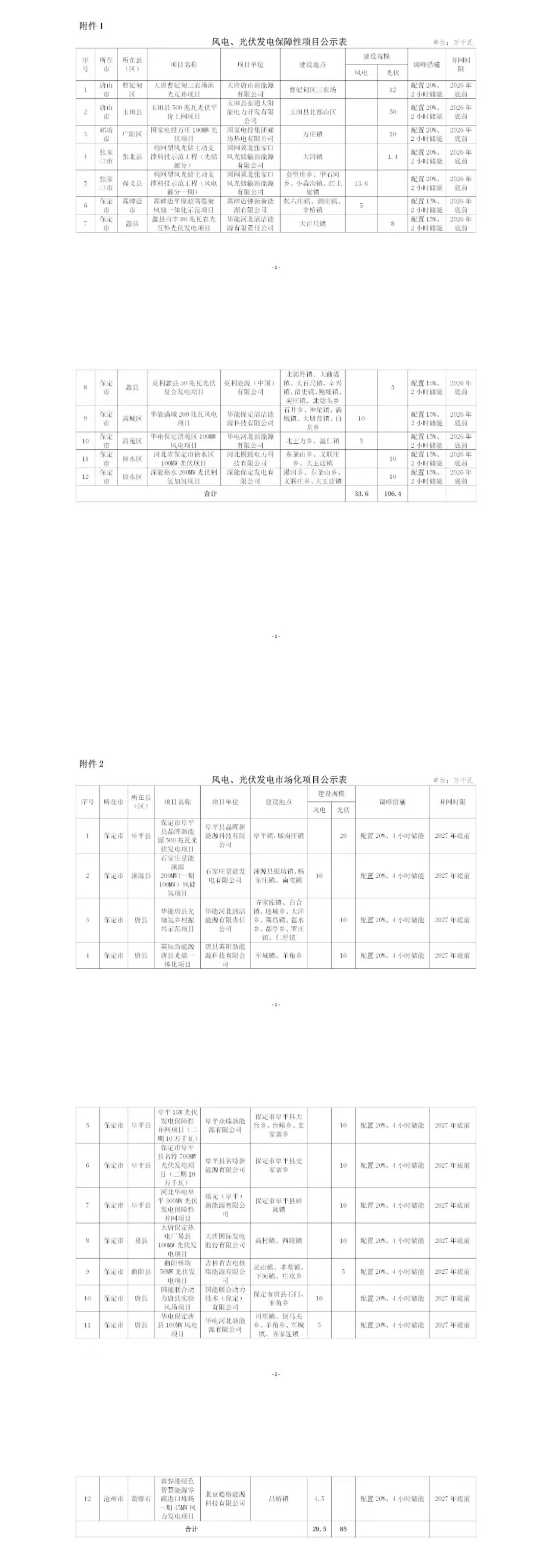 第二批:24個、2.5GW納入第二批的項目共25個,總規(guī)模259.5萬千瓦,其中保障性項目共13個、145萬千瓦,市場化項目共12個、114.5萬千瓦。根據(jù)調(diào)峰措施方面,保障性規(guī)模的配儲比例在15-20%/2小時,而市場化項目配儲比例大多為20%/4小時。第二批次獲得容量的項目業(yè)主中,唐山海泰新能源獲得規(guī)模最大,為500MW風(fēng)電項目,另外華能(280MW,含100MW風(fēng)電)、華電(250MW,含150MW風(fēng)電)、大唐(220MW,含120MW風(fēng)電)。國家電網(wǎng)(含136MW風(fēng)電)和國家電投(全部為光伏)各獲得150MW項目。