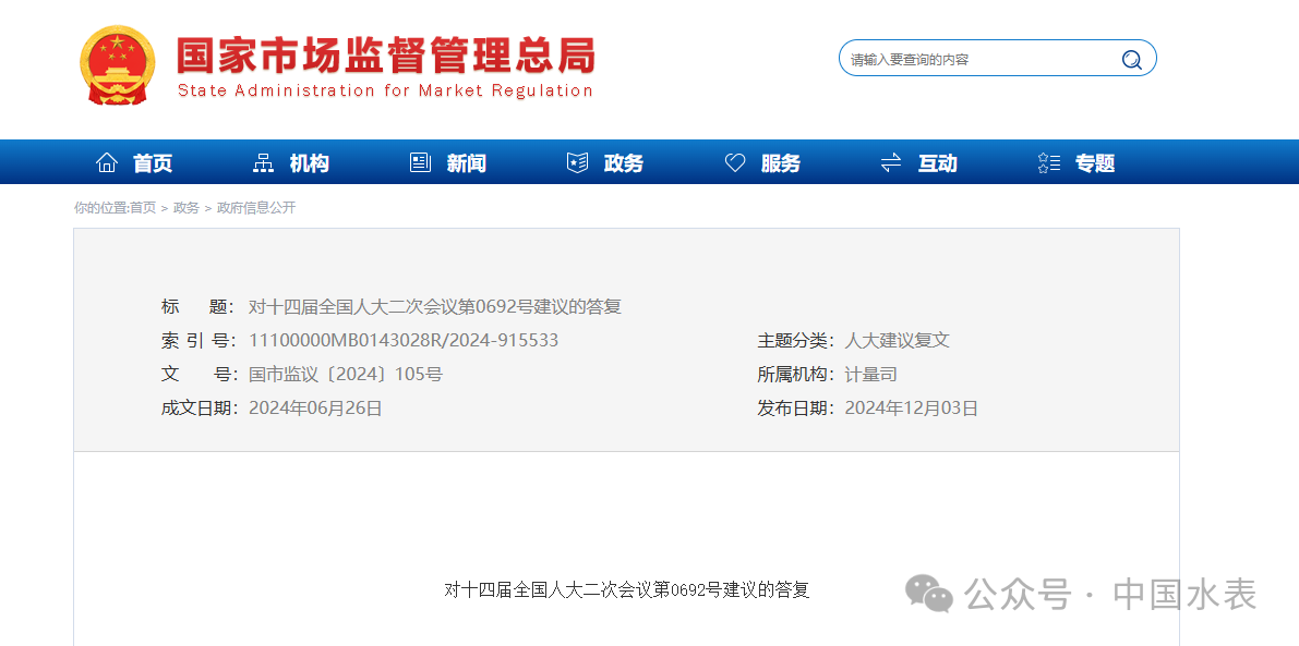 人大代表建議水表檢定“二檢合一” 市場監管總局回復