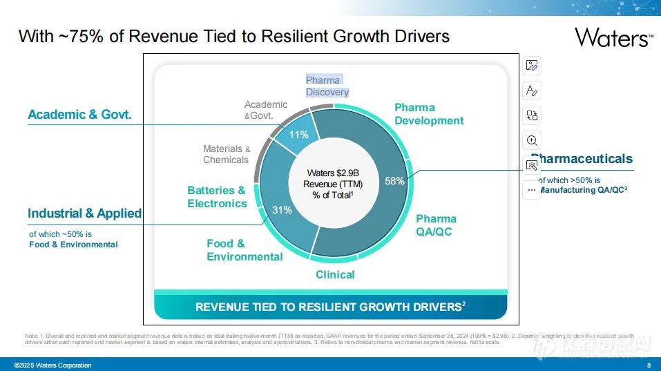 Batra指出,Waters專注于監(jiān)管嚴格且需求尚未被充分滿足的市場,市場總體規(guī)模約為120億美元,并以中個位數(shù)的速度穩(wěn)定增長。在生命科學領域,制藥行業(yè)的長期增速約為高個位數(shù),主要得益于新型治療方法和生物制劑的推動;而臨床領域同樣以高個位數(shù)增長,重點聚焦特定臨床細分市場,尤其是質譜技術在早期疾病檢測和小分子分析中的應用。此外,在工業(yè)與應用領域(包括食品和環(huán)境市場),增長率約為中個位數(shù),受全球人口增長以及對安全食品和清潔水源需求的推動;同時,PFAS(全氟和多氟化合物)檢測需求及減少食品和環(huán)境中雜質的趨勢也帶來了新的增長機遇。材料領域的增速為中個位數(shù),近期受經濟電氣化進程加速的推動,尤其是電動車需求的增加表現(xiàn)出更強勁的增長。而學術與政府領域作為最小的終端市場,其長期增速為低個位數(shù),主要依賴政府撥款支持。