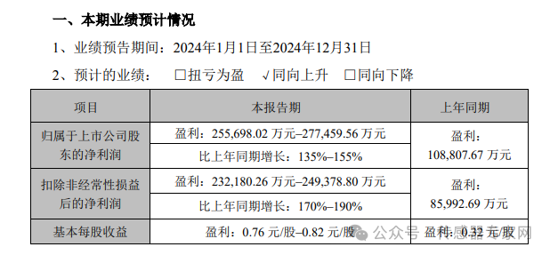 經財務部門初步測算,預計 2024 年實現歸屬于母公司所有者的凈利潤為315,529.74 萬元到 335,529.74 萬元,與上年同期相比,將增加 259,967.34 萬元到279,967.34 萬元,同比增加 467.88%503.88%