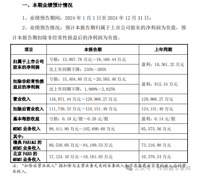 報告期內,歸屬于上市公司股東的凈利潤為-13,987.78 萬元~-19,168.44 萬元,比上年同期下降235%285%,扣除非經常性損益后的凈利潤 為-15,404.80 萬元~-20,585.46 萬元,比上年同期下降1,989%2,625%,營業收入116,971.44 萬元~129,968.27 萬元,MEMS 業務收入98,411.90 萬元~102,690.68 萬元,瑞典 FAB1&2 MEMS 業務收入80,538.68 萬元~84,199.53 萬元 ,北京 FAB3 MEMS 業務收入17,124.10 萬元~18,161.93 萬元。