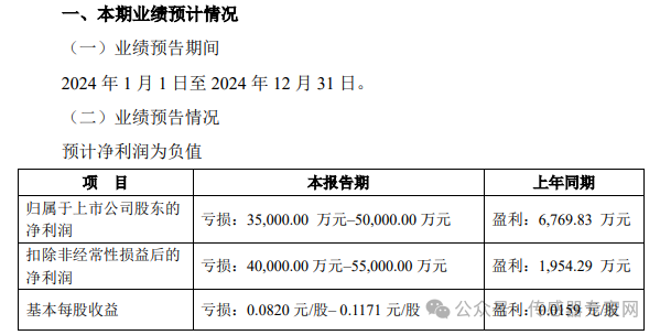 公司預計 2024 年度實現扣除非經常性損益后歸屬于母公司所有者的凈利潤-49,000.00 萬元至-41,000.00 萬元,較上年同期相比,將減少 1,687.93 萬元至9,687.93 萬元。